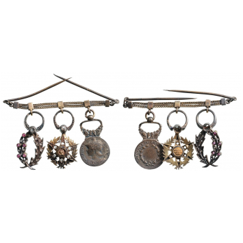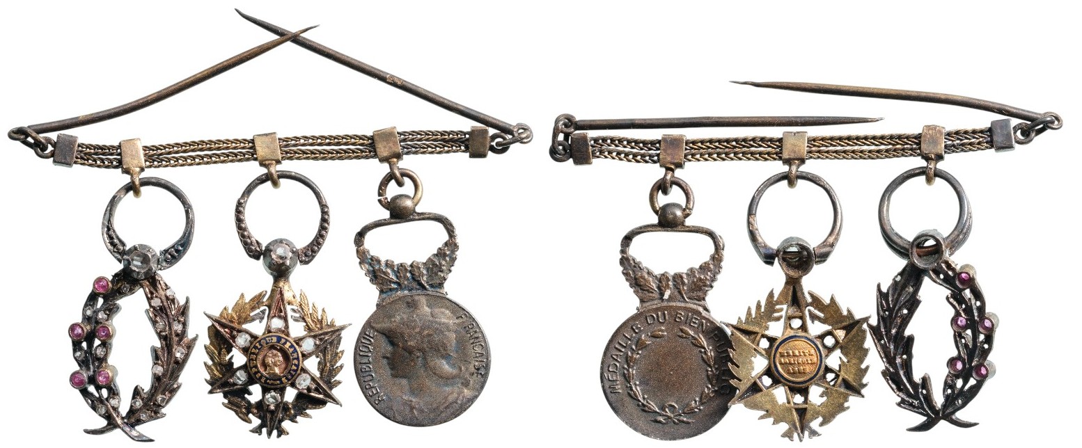 Order of the Academic Palms in Diamonds and Rubies; Agricultural Merit Order in Diamonds; Medal for Public Well-Being . Breast Badges, Silver, one-side enameled, original suspension rings on chain. Very attractive, jeweler's quality bar! I