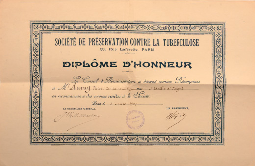 SKU: 667 The Live Auction begins in: Click here to register for the live Auction Starting price 10 EUR Log in to place a bid. Total bids: 0FRANCEDiploma for a Silver Medal of Honor of the Society of Preservation against Tuberculosis awarded to a French Officer, 32x50 cm, dated 1907, folded. I Shop ID: 30552Auction LXX - Day 1