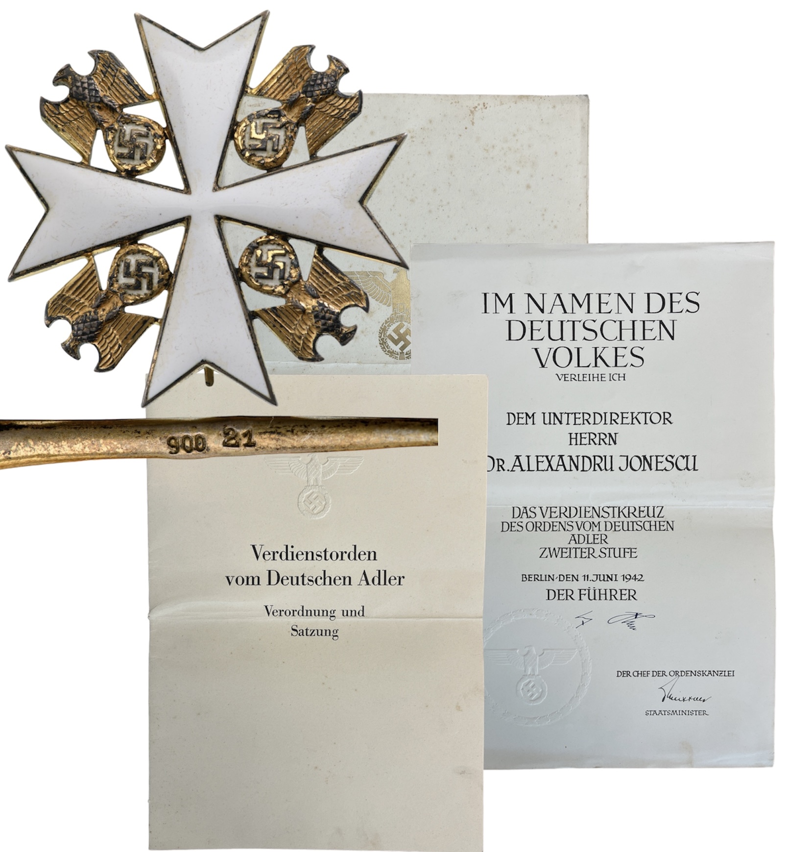 Officer's Cross, 4th Class, instituted in 1943. Breast Star, 50 mm, gilt Silver, hallmarked "900 - 21", one-side enameled, original pin on reverse, together with awarding document and statutes, named to a Romanian citizen, dated 11th of june 1942. A superb and very rare set in extremely fine condition, intact silver gilding! I RR!