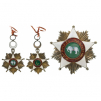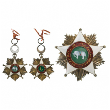Grand Cross Set of the Order. Sash Badge, 107x 69 mm., in gilt Silver as a white enameled, five-pointed star with grooved border and ball-finials flanked by polished rays, green enameled centre medallion bearing the image of a white elephant wearing a saddle-cloth at the Sultan’s colours, in finest, raised enamel miniature, red enameled outer circlet, with inscription in Cameroonese-Arabic calligraphy, accurately set in gold-foil, stirrup-shaped upper loop to which is attached/hinged a white enameled crescent with sphaerical loop and round, suspension ring, green enameled reverse centre medallion, bearing the Arabic, calligraphic “Ba” monogram in gold foil, within red enameled outer circlet, also bearing a long, calligraphic inscription, similarly to the obverse, the suspension ring, with thin ribbon strip at the right colours of the now missing, original sash ribbon. Breast Star, 86x 83 mm. in gilt Silver and enamels, similar to the badge’s obverse, but larger and very convex, also with the beautifully, miniature painted centre medallion, enclosed by the red enameled outer circlet, enriched by long, calligraphic inscription in gold-foil, polished reverse, with broad, tapering pin (this, struck with French silver- and maker’s marks, probably of Lemaitre, Paris) and two side-hooks.A beautifully-made and extremely rare set of this order, perhaps one of the finest orders created in Africa, maybe unique, this being the best made and perhaps the elder one, almost excellent condition and with beautiful, attractive patina. I RR!Note: the Reign of Foumban and the Lordship (Mfon) of the Bamoun people, is one of the oldest Kingdoms of Africa (theoretically founded in 1394 AD), in the late 19th Century reached a grade of modernity due to the contacts and commerce with the Europeans, although still retaining tribal and ancient traditions and costumes. Sultan Ibrahim Nyoya, 18th ruler on the Foumban throne (reigned between 1889-1931), converted himself and his people to Islam, although retaining the right to follow christianism and the tribal worships, until a new religion, mixing the characters of Islam, Christianity and local religions was created, along with a common language and writing, under his rule, a system of Orders and Decorations was also created, where the hereby offered set is an almost unique testimony, probably from the belongings of Ibrahim Nyoya himself, or inherited by his successor, Seidou Njimoulou Nyoya (1933-1992).
