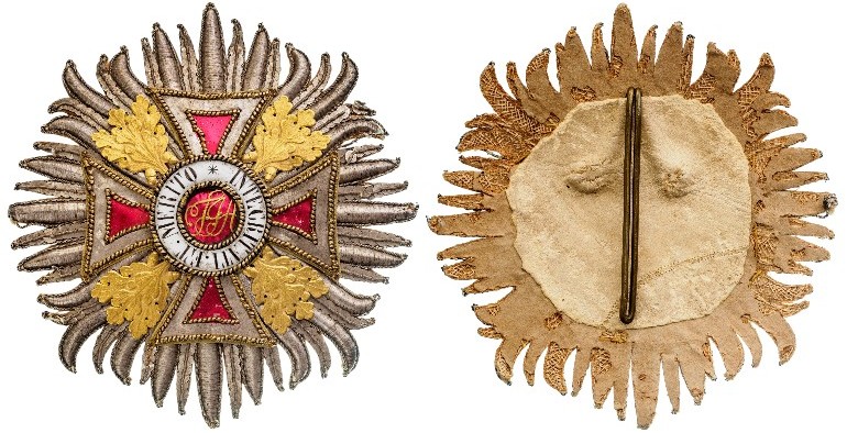 An early, embroidered 1st Type Grand Cross Star. Breast Star, 103 mm., Silver rays made of thin, narrow silver-strip, the centre, made as the Order’s cross, made of sheet-silver, partly lacquered of red, bordered with gold wire, red lacquered centre medallion, with golden monogram “FIA” (Franciscus Imperator Augustus), white enameled outer circlet, bearing the Order’s motto “INTEGRITATI ET MERITO” in black lettering, the arms, flanked by beautifully chiseled oak leaves, made of gold, the reverse with original backing and a long hook made of brass wire, to affix the star to the habit, allowing an easy removing of it.