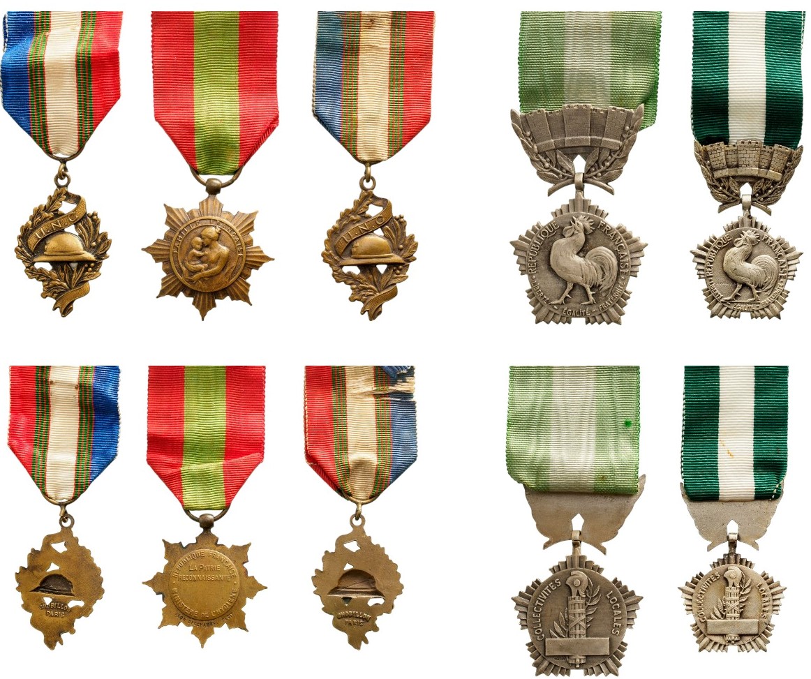 Two Union of Veterans Association. Breast Badges, 38x25 mm, Bronze, original suspension rings and ribbons; Medal for the French Families. Breast Badge, 35 mm, Bronze, original suspension ring and ribbon. Attributed to "Leon Deschamps. Fecit"; Two Honour Medal for Local Collectivities. Breast Bagdes, 63x38 mm, silvered Metal, original suspension rings and ribbons. I-II (5)