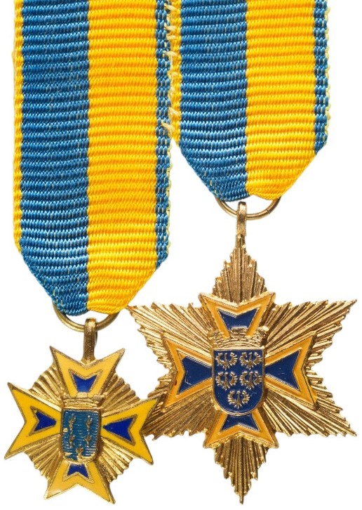 Grand Cross Set Miniatures. Breast Badge, 18x15 mm, gilt Bronze, one side enameled, original suspension ring and ribbon. Breast Star, 23 mm, gilt Bronze, superimposed part enameled, original suspension ring and ribbon. A beautiful rare set, in very fine condition! I R!
