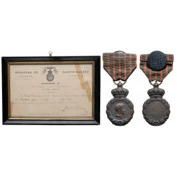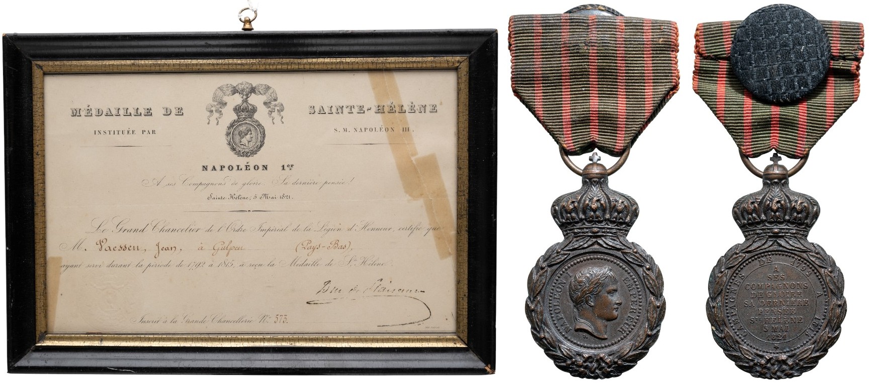 Breast Badge, 51x31 mm, Bronze, original suspension ring and ribbon, together with original awarding document to a Dutchman, who served between 1792 and 1815, dated 5th of May 1821. Interesting group! I