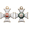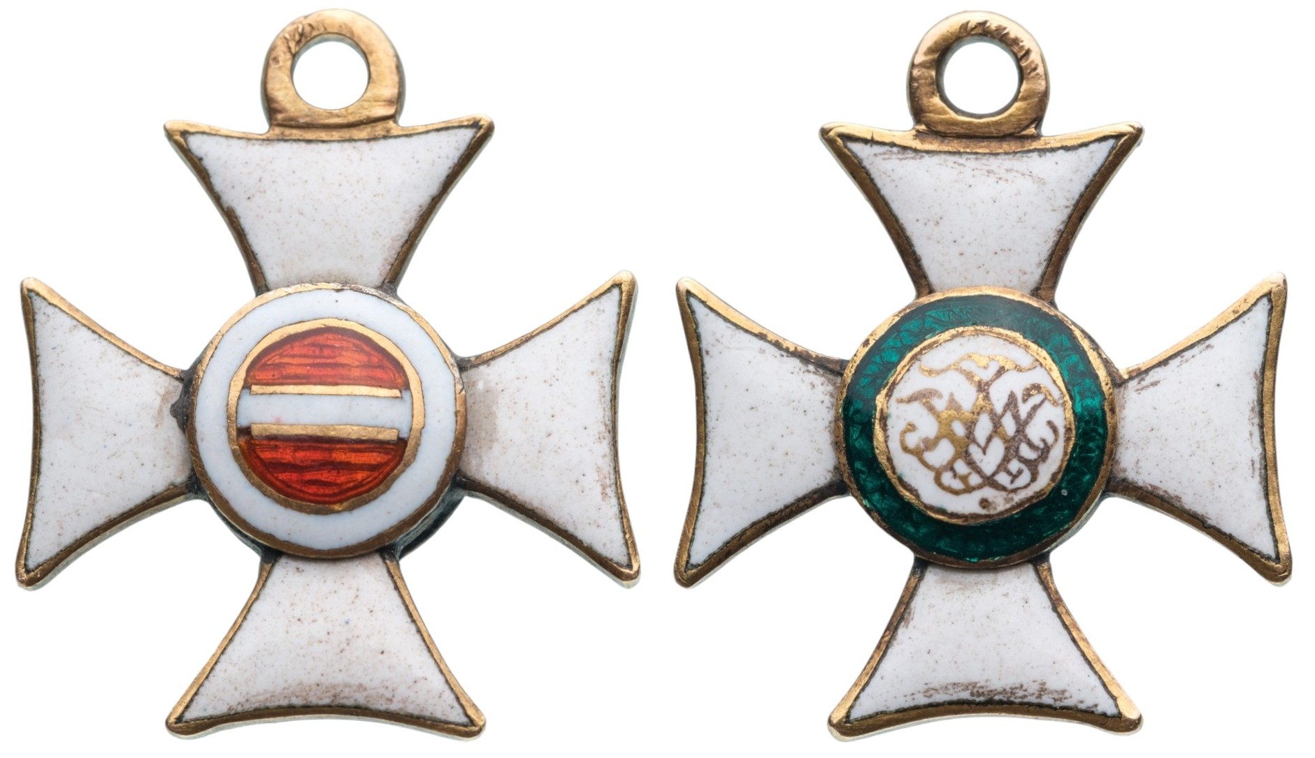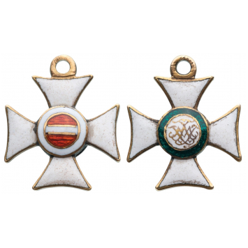 A Miniature of the Order, 19 x 15 mm., GOLD, white enameled cross of typical form, obverse centre medallion with the enameled colurs red-white-red, within white enameled outer circlet, white enameled reverse centre medallion, bearing the Imperial monogram, within translucent, green enameled outer circlet; round upper loop.