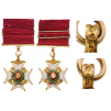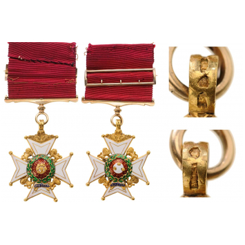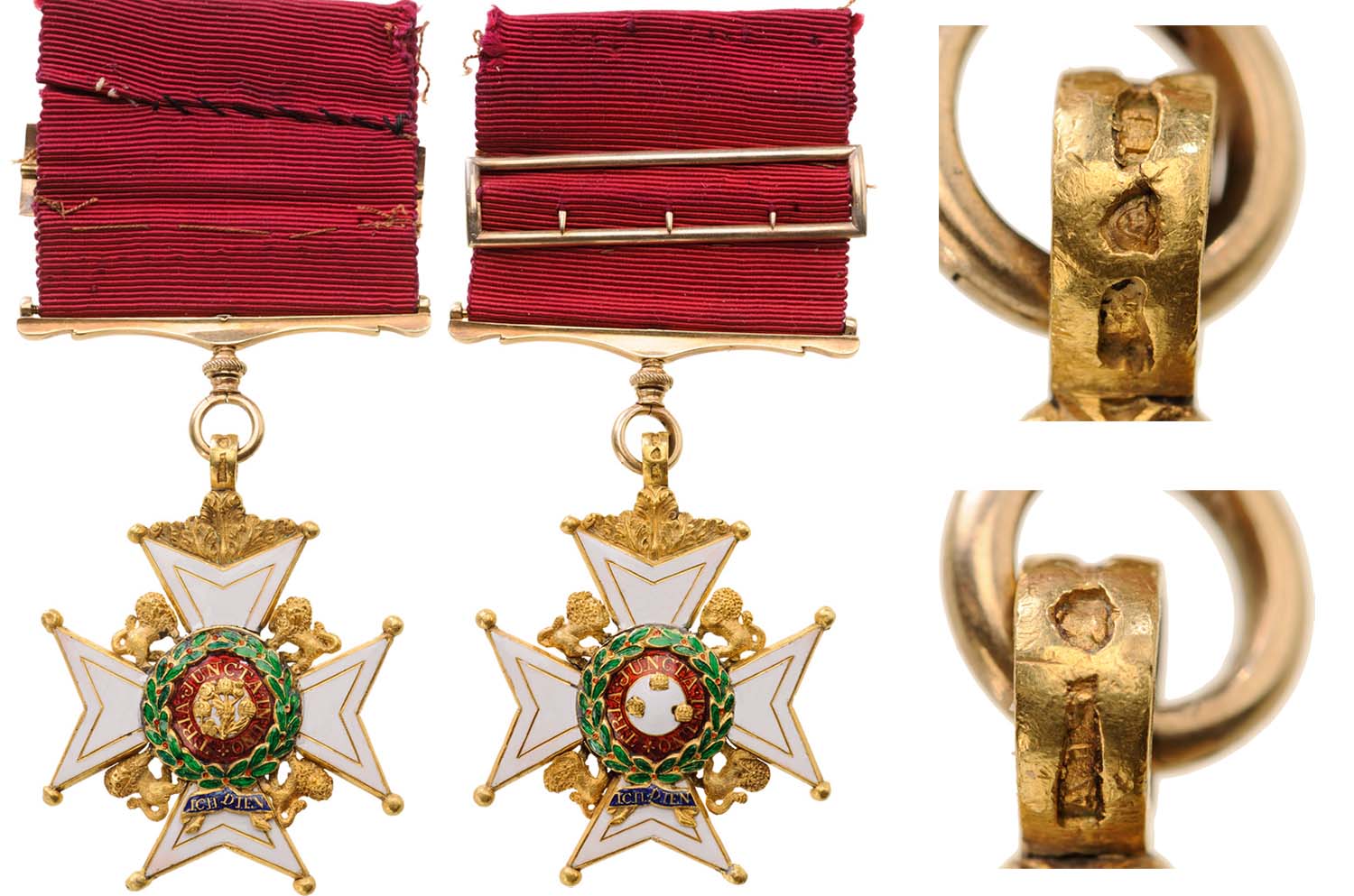 Companion`s Badge of the Military Division (C.B.), in GOLD, 45 mm, approx. 30 grams, both sides enameled (damages), both central medallions gold and enamels, original suspension ring and original ribbon with gold brooch. A very early order of finest British manufacture, of the beginning of the 19th century! II RR!