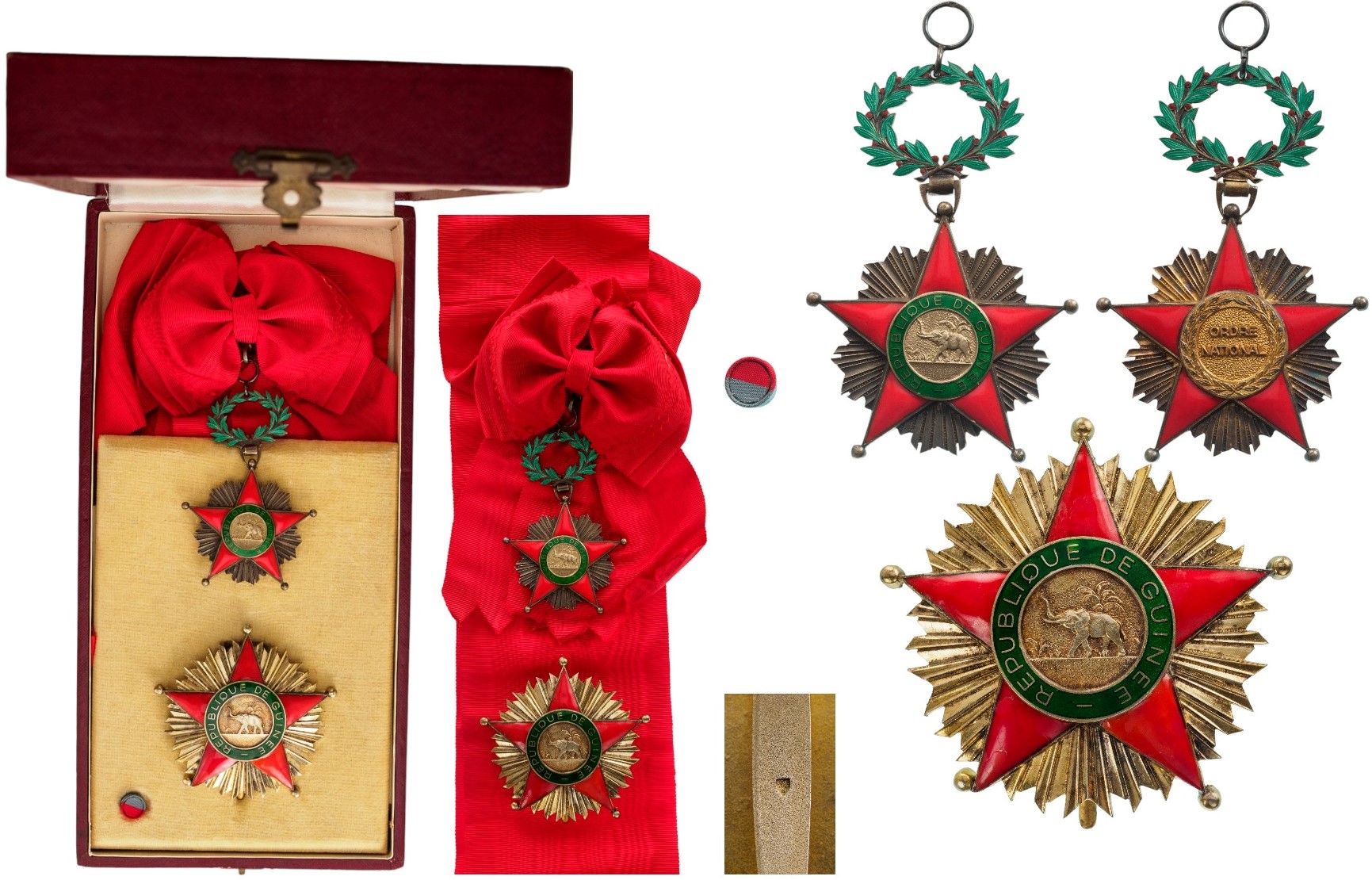Grand Cross Set, instituted in 1968. Sash Badge, 58x85 mm, gilt Silver, enameled, original suspension wreath and sash. Breast Star, 80 mm, gilt Silver, hallmarked on the pin, enameled, vertical pin on the reverse, in original case of issue by "Chobillon, Paris" and lapel hole rosette. A rare set, in mint condition! I R!