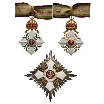Grand Officer's Set, 2nd Class, 1st Type Neck Badge, 99x64 mm, gilt Bronze, both sides enameled, original suspension ring, loop and short ribbon. Breast Star, 96 mm., Silver, superimposed part enameled, large pin on reverse. A rare set, in extremely fine condition! I R!
