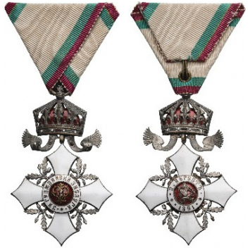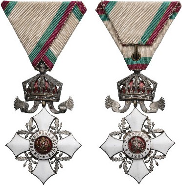 Knight's Cross with crown, 5th Class, 2nd Pattern, 1910. Breast Badge, 73x47 mm, silvered, central medallion enameled, original suspension ring and triangular ribbon. A badge of best quality, and extremely fine condition! I