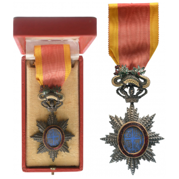 Knight's Cross, 5th Class, instituted in 1886. Breast Badge, 83x49 mm., Silver, brilliant cut rays, central medallion enameled, original suspension device, ring and ribbon, in case of issue. A very fine badge, in extremely fine conditionI