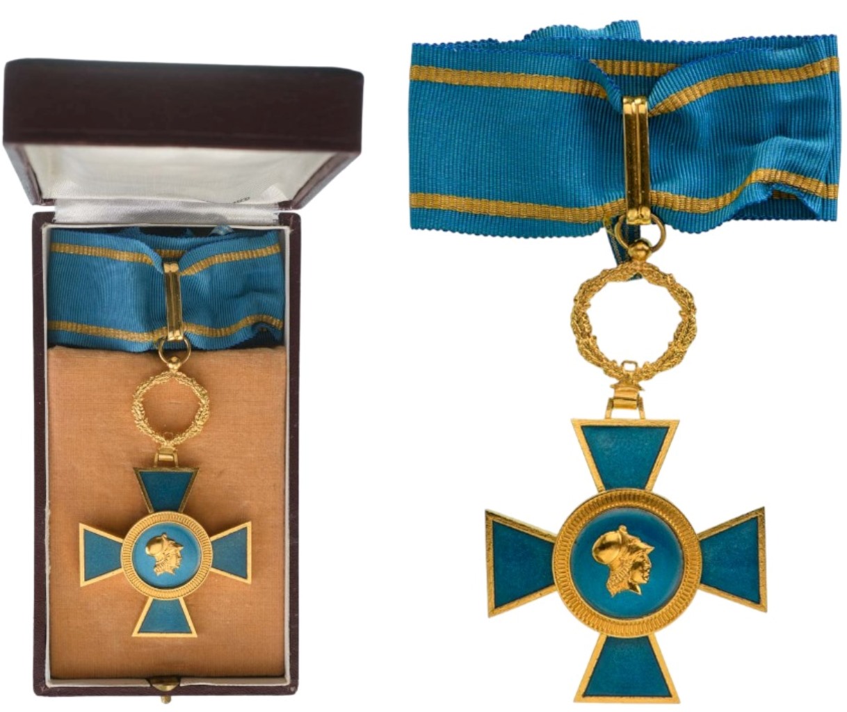 Commander's Cross, 3rd Class. Neck Badge, 62x55 mm, gilt Bronze, enameled, central medallion gilt (reverse missing), enameled, with original suspension wreath, loop, ring and ribbon, in case of issue by "Arthus Bertrand, Paris". Rare! IV R!