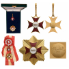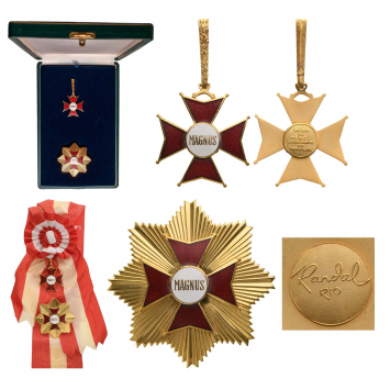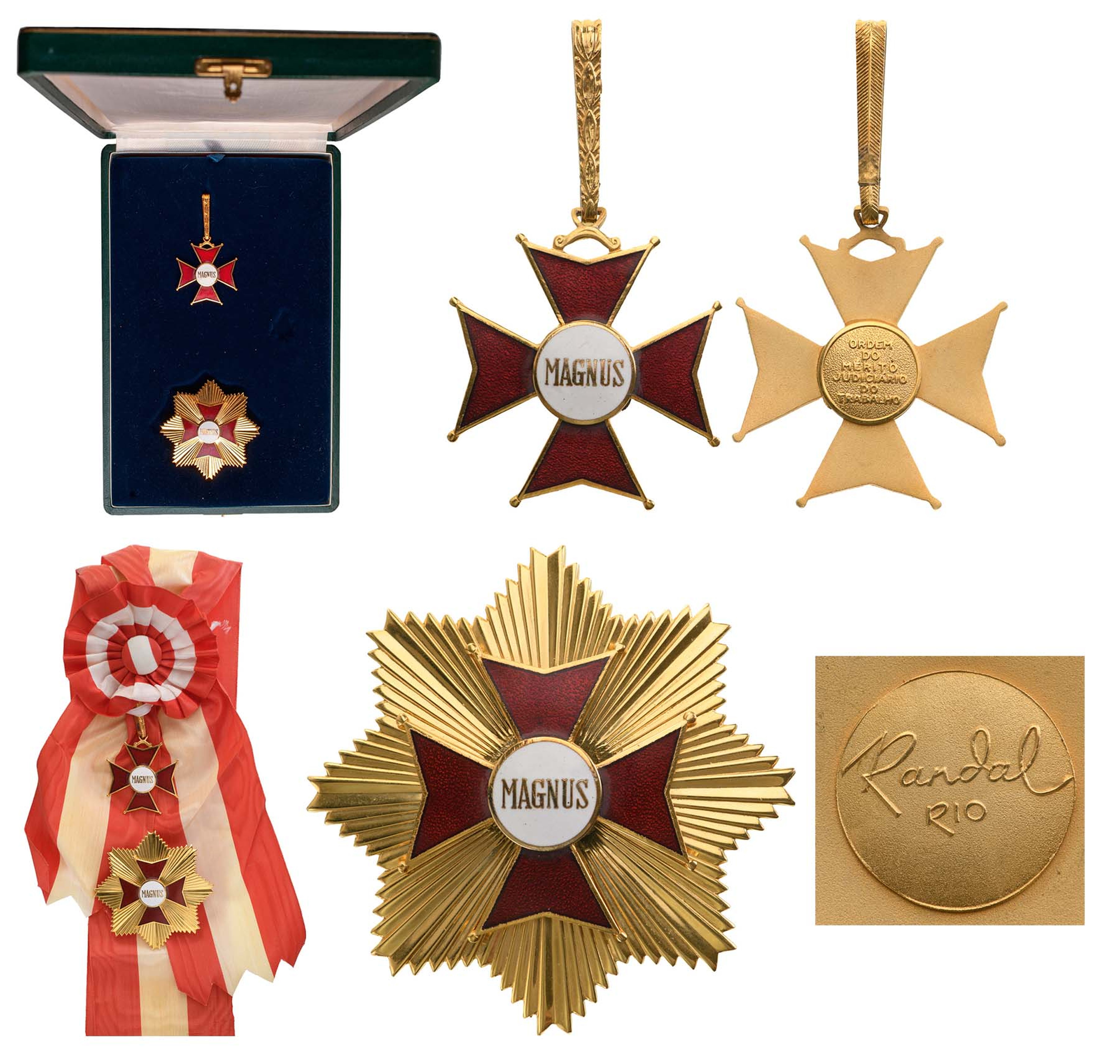 Grand Cross Set, 1st Class. Sash Badge, 53x46 mm, gilt Bronze, one-side enameled, both central medallions gilt and inscription on reverse, original suspension loop and complete sash. Breast Star, 75 mm, gilt Bronze, maker's mark "Randal, Rio", enameled, reverse with 3 pins, in case of issue by "Randal, Rio", with enameled miniature, lapel bar rosette and ribbon bar. Extremey fine and scarce set! I R!