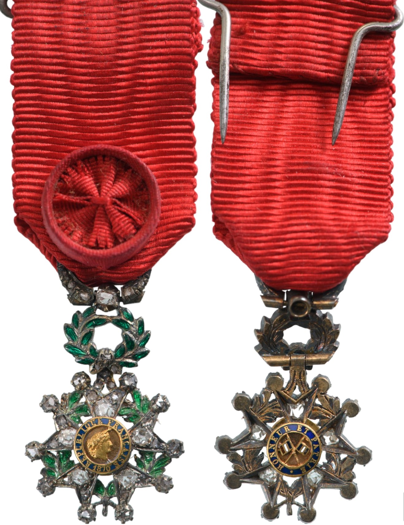 Officer`s Cross Miniature De Luxe with Brilliants, 3rd Republic (1870-1940), 4th Class. Breast Badge, 24x16 mm, GOLD with brilliants, enameled, central medallions GOLD, enameled, original GOLD suspension ring with diamonds and ribbon with rosette. A superb miniature of spectacular appearance and quality! I R!