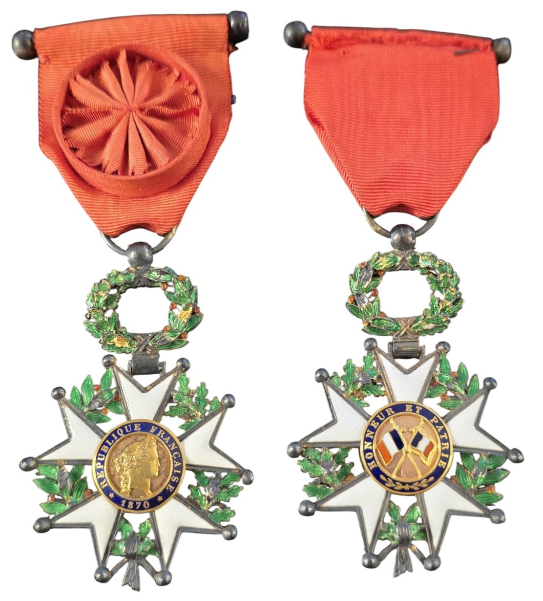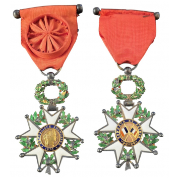 Knight`s Cross de Luxe, 3rd Republic, 5th Class. Breast Badge, 63x42 mm., Silver, multipart construction, both sides enameled, both central medallions polished GOLD, enameled, original suspension ring and ribbon. Rare and superb jeweler's quality! II R!