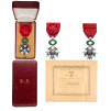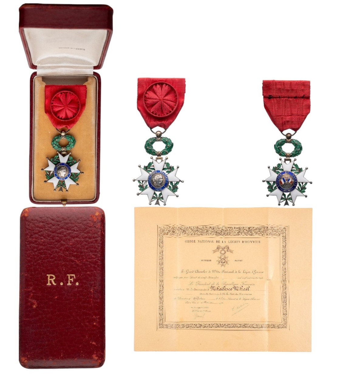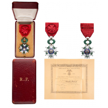 Officer`s Cross, 3rd Republic, 5th Class. Breast Badge, 59x40 mm., Silver, both sides enameled, original suspension ring and ribbon with rosette, in case of issue by "Arthus Bertrand - Paris", with gilt iinitials on the lid, together with awarding document to a Romanian Commander, Aide-de Camp of King Carol II, dated 11th of February 1938. Superb and very interesting provenance! I