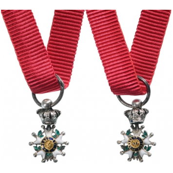 Knight's Cross Miniature, 2nd Empire (1852-1870), instituted in 1802. Breast Badge, 15x10 mm, Silver, enameled, gold centers, original suspension ring and long ribbon. A superb jeweller's quality in very fine condition! I-