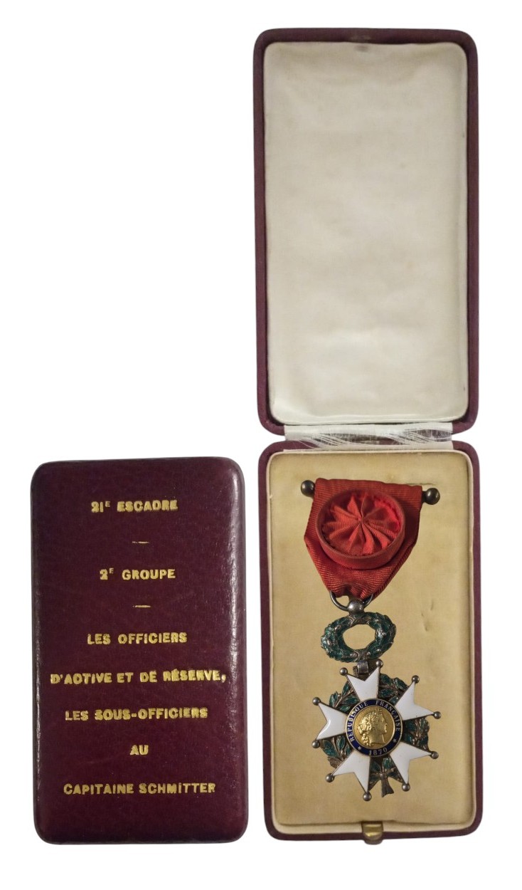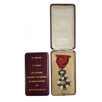Officer`s Cross, 3rd Republic, 5th Class. Breast Badge, 60x40 mm., Silver, both sides enameled, original suspension ring and ribbon, in luxury case of issue, with gilt dedication on the lid to A Captain by the Officers of the Escadron. Very intersting! I