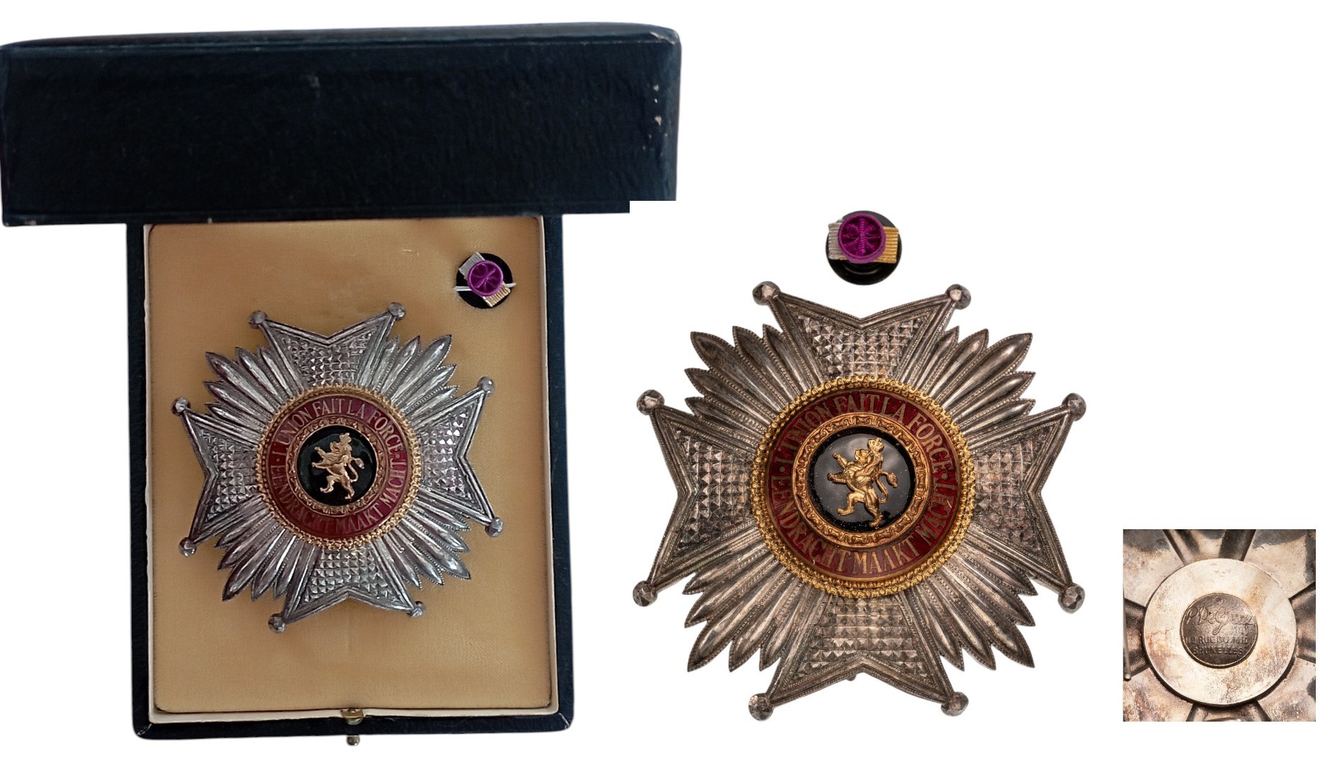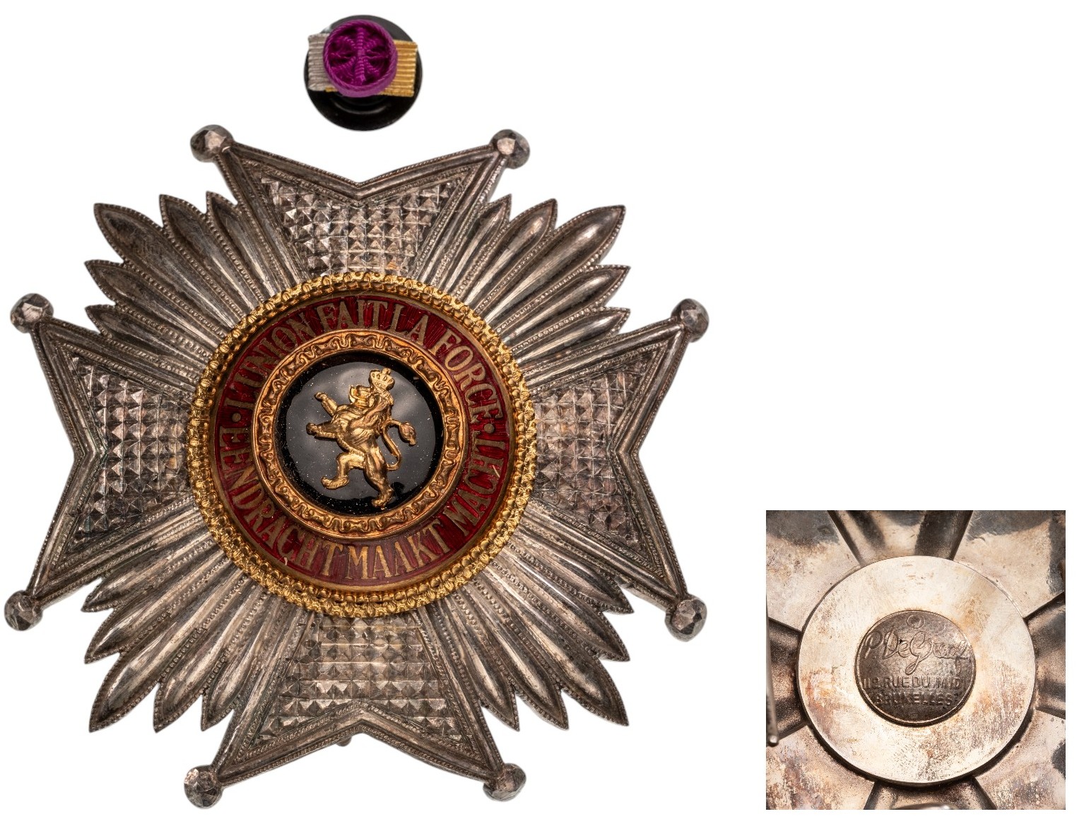 Grand Officer's Breast Star, instituted 1832. Breast Star, 86 mm, Silver, central medalion gilt Silver, maker's "DeGreef, Bruxelles", with two side hooks and wide tapered pin on the back, in original case of issue by "de Greef, Bruxelles" with lapel hole roseete. I
