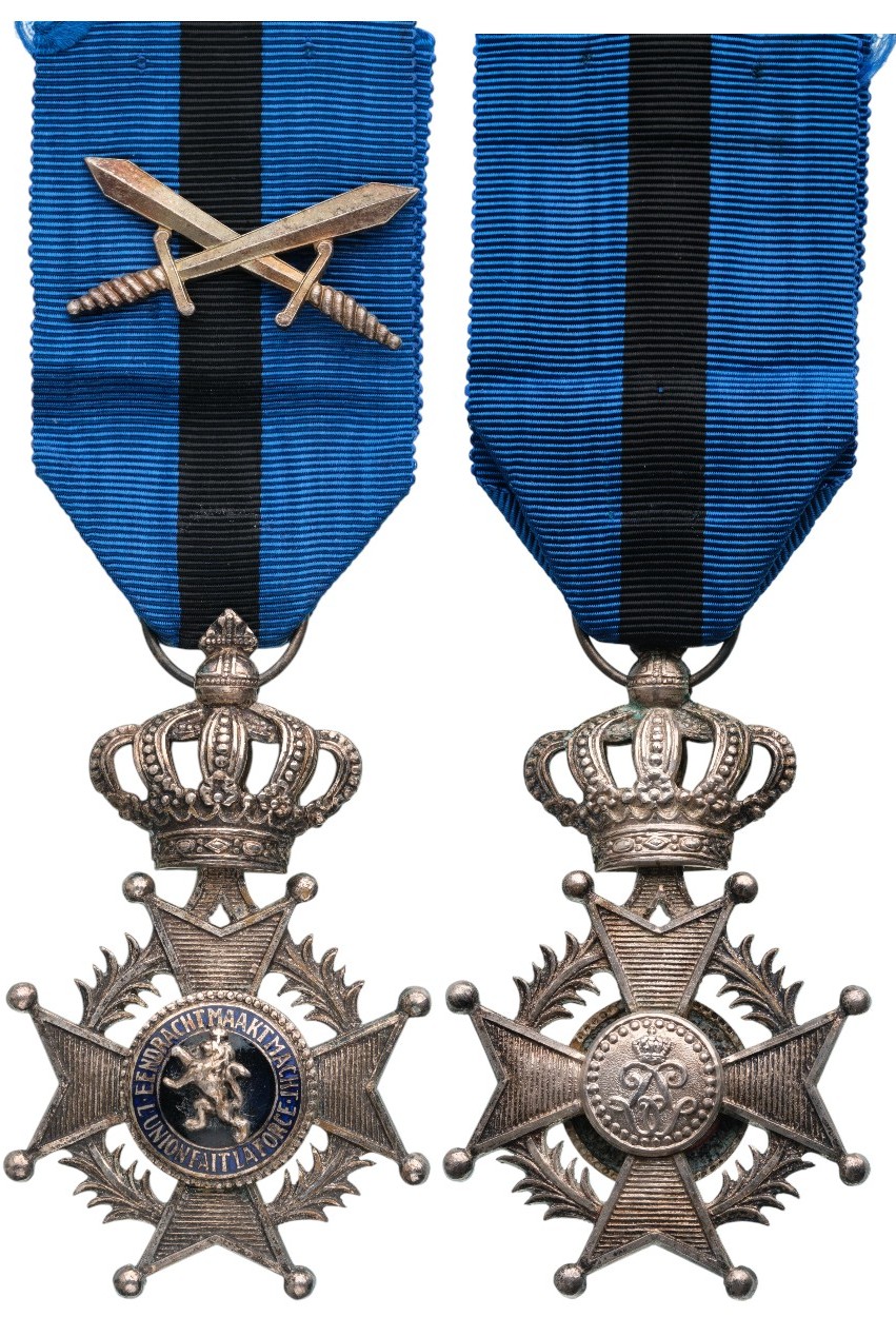 Knight's Cross Military, 5th Class, instituted in 1900. Breast Badge, 66x40 mm, silvered Bronze, one side enameled, original suspension crown, ring and ribbon with crossed silver swords. A beautiful cross in extremely fine condition! I