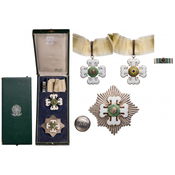 Grand Officer's Set, 2nd Class, instituted in 1934. Neck Badge, 60x55 mm, gilt Silver, enameled, both central medallions gilt silver, enameled, original suspension loop and neck ribbon with lapel hole rosette. Breast Star, Silver, 75 mm, superimposed part gilt silver, enameled, maker's mark "Randal, Rio", reverse with long vertical pin, in case of issue by "Randal, Rio". Extremey fine and scarce set! I R!