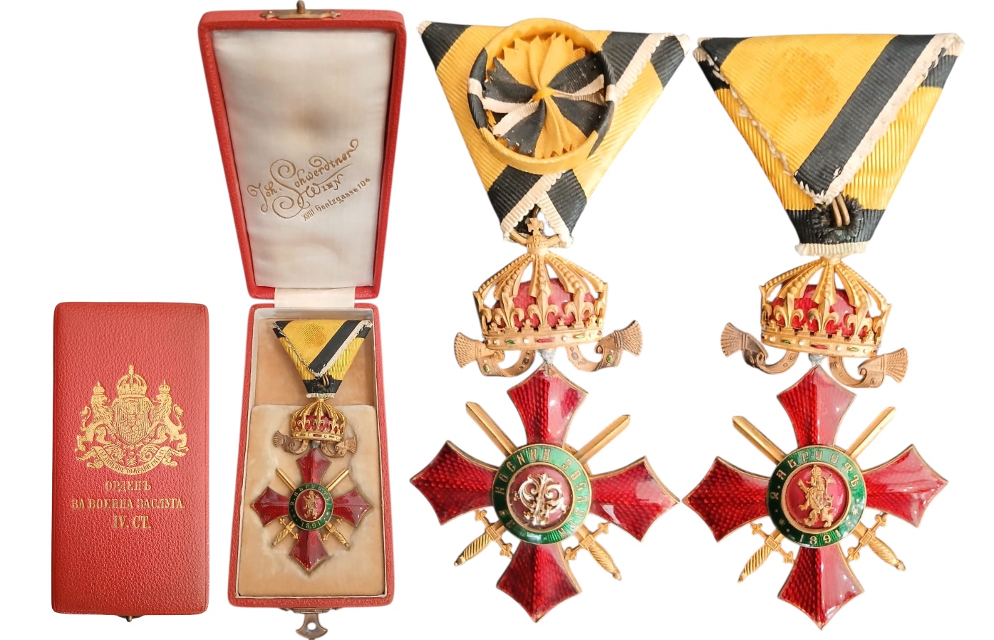 Officer's Cross with Crown, 4th Class, 1st Model, 1900 - 1933, Breast Badge, 75x51 mm, gilt Bronze, central medallion enameled, original suspension ring and ribbon with rosette, in case of issue, with gilt weapon on the lid, by "Johann Schwerdtner, Wien". Extremely fine condition and best quality! I