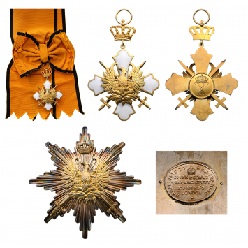 medallion with the King`s monogram, suspended to its original sash. Breast Star, 87 mm, Silver with smooth, highly polished rays, superimposed with a large gilt phoenix on crossed swords, gilt crown fixed to