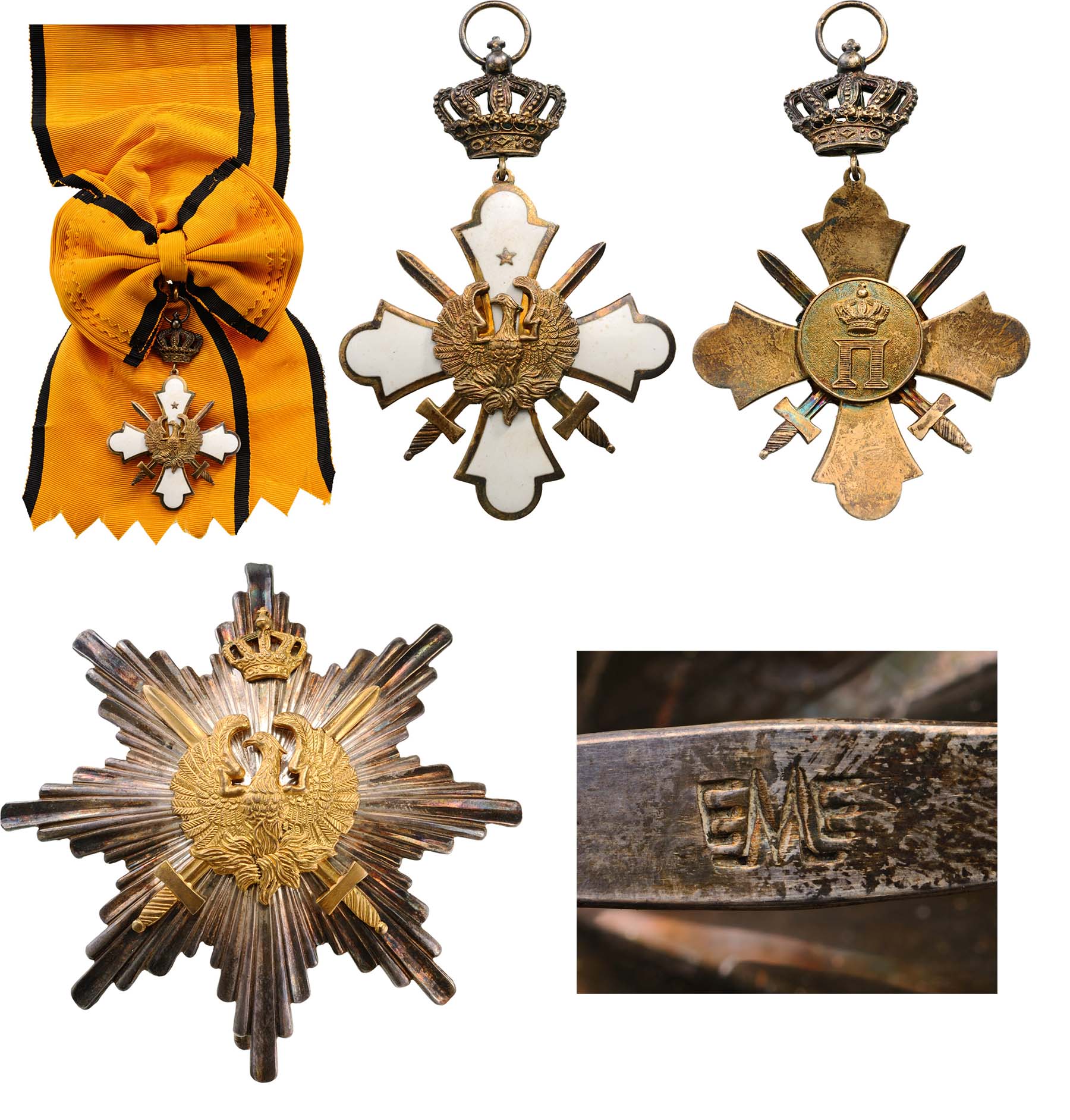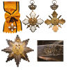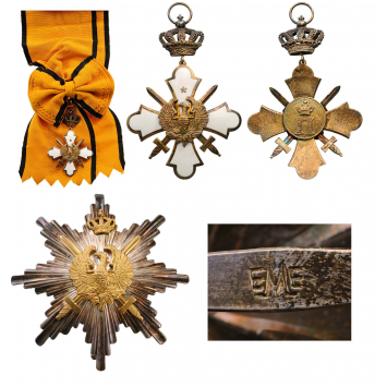 Grand Cross Set with Swords (2nd Type, from 1941). Sash Badge, 86x61 mm, in gilt Silver and white enamel, smooth reverse, applied centre medallion with the king's monogram, with original sash. Breast Star, 84 mm, in Silver with smooth rays, superimposed with gilt phoenix, resting on crossed swords, gilt crown fixed to the upper ray, reverse with broad pin (struck with "EME" mark of Anagnostopulos, Athens) and two hooks. A very rare class of this order, created in 1936, very fine condition and nicely toned. I RR!