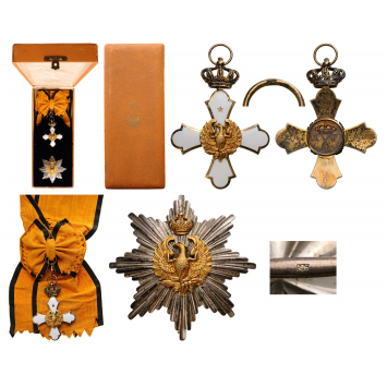 Grand Cross Set of the 2nd Type, 81x59 mm, gilt Silver, white enameled badge, centre medallion with the frosted-finishes, gilt phoenix rising from the flames, reverse medallion with royal monogram of King George II from 1936), upper loop and royal crown suspension and circular ring; original full length sash with bow. Breast Star, 82 mm, with smooth, convex and concave rays, gilt phoenix, the top ray with a gilt, royal crown; the reverse with rivets, broad pin (hallmark "925") and two side hooks; in the original, orange case of issue with the Phoenix embossed in gold on the lid, maker`s mark of Zimmermann, Pforzheim and of P. Zenetos Freres, Athens, printed on the inner cushion. An very rare group of finest manufacture; very fine condition. I RR!