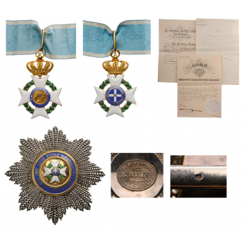 Grand Officer`s Set of the 1st type in GOLD and enamels (minor chips), 69x45 mm, centre medallion with King Otto`s head facing right, and the colours of Bavaria on the reverse`s centre, suspension crown linked to the cross with the typical loop and thin hinge of the Bavarian-made pieces, plain, polished ribbon ring, original neck ribbon. Breast Star, 75 mm, with chiseled and pierced rays, centre medallion in gold, with applied the enameled order`s cross, within blue enameled outer circlet bearing golden, Greek inscription, the reverse, with French marks and the maker`s escutcheon of Halley, Paris, further, the award papers dated July, 1853, to the Spanish gentleman Don Jose Pizarro.A very rare and superb set, very fine condition. II RR!