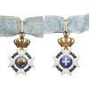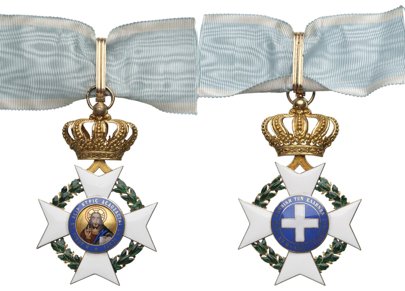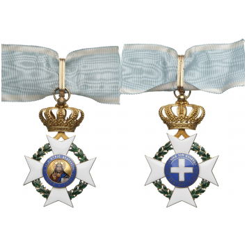 Commander's Cross, 73x46 mm, GOLD, approx. 24 g., enameled, obverse centre medallion with finest enamel painting of the Christ Pantokrator, large, bulbous crown, original suspension ring, loop and short modern ribbon. Excellent quality and condition! I