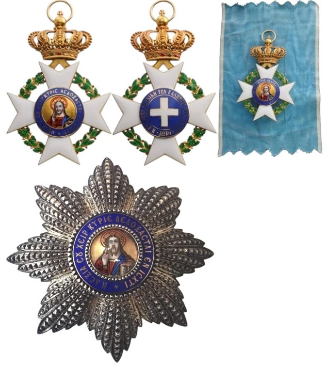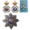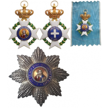 Grand Cross Set, 2nd Type. Sash Badge, 88x58 mm, GOLD, approx. 40 g., both sides enameled, both central medallions GOLD, enameled, original suspension ring and short sash. Breast Star, 91 mm, Silver with chiseled and pierced rays of very convex shape, center medallion in gold and enamel of excellent quality, vertical pin and two retaining hooks to reverse. A superb set in mint state! I
