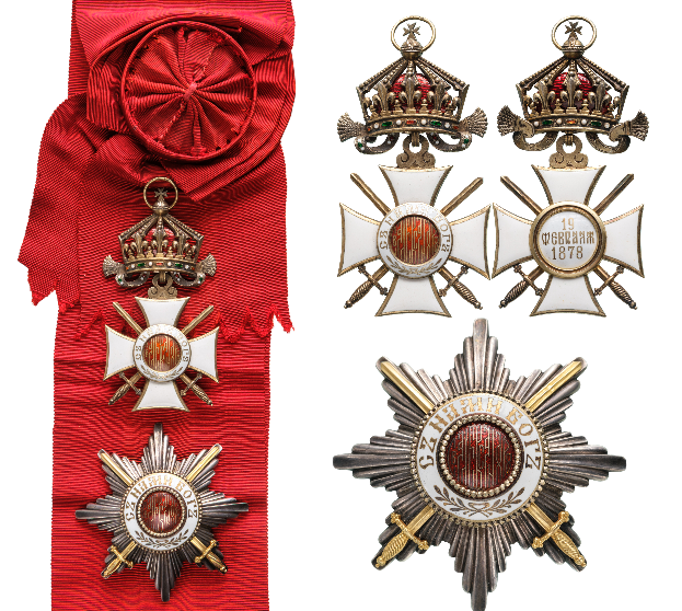 Grand Cross Set Military, 2nd Model. Sash Badge, 107x54 mm., gilt Silver, maker's mark "FR - C.F. Rothe" both-sides enameled, original suspension ring, and sash. Breast Star, 81 mm, Silver, hallmarked "AA", maker's mark "C.F. Rothe - Wien", original pin on reverse. A splendid and very rare set of best quality and mint condition! I RR!