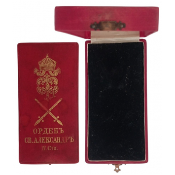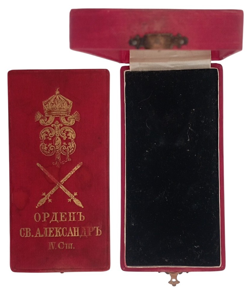 Officer's Cross, 4th Class with Crown and Swords. Original Case of Issue, with gilt monogram of Tsar Ferdinand I and inscription on the lid. A scarce box in extremely fine condition! I R!