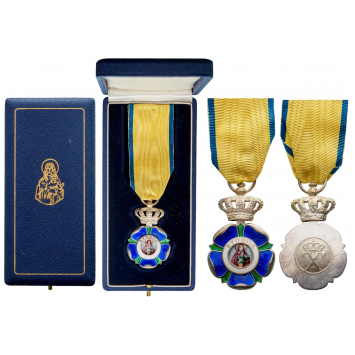 Knight`s Cross, 1st Type, 51x32 mm, Silver badge with pale blue and green enameled details, the centre with the image of the Virgin and the Child Jesus Christ in the finest enamel work, within a white enameled circlet with inscription, reverse medallion with royal monogram "G II " (for King George II), hinged crown suspension and original ribbon, in the original, dark blue case of issue with the Virgin embossed in gold on the lid and the maker's mark of Kelaidis, Athens, printed on the inner cushion. A rare cross of this order instituted in 1948 and awarded to noble, high ranking ladies for exceptional humanitarian merits, extremely fine condition. I R!