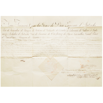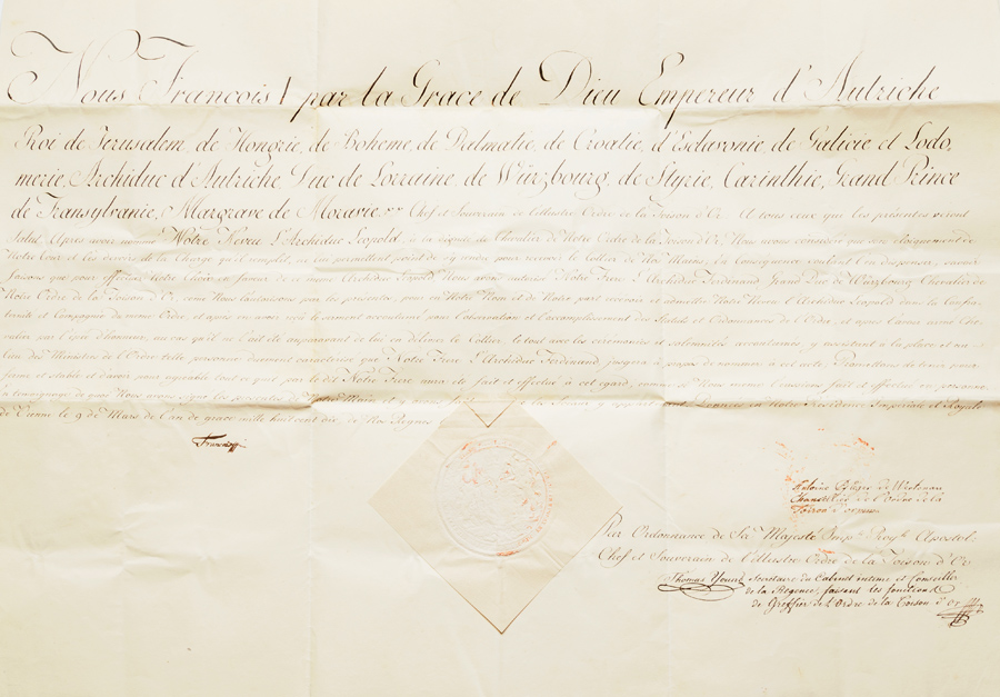A bestowal document addressed to Archduke Leopold (1797–1870), nephew to the Emperor and later Grand Duke of Tuscany; given in Vienna, March 9th 1810, bearing the original signature of Emperor Francis I and of Anton Pfleger v. Wertenau (Chancellor of the Order) and Thomas Young (Secretary to the Imperial Cabinet and acting "Greffier" of the Order), 72,7 x 51,5 cm., the lower centre of the document, with embossed seal of the Order.