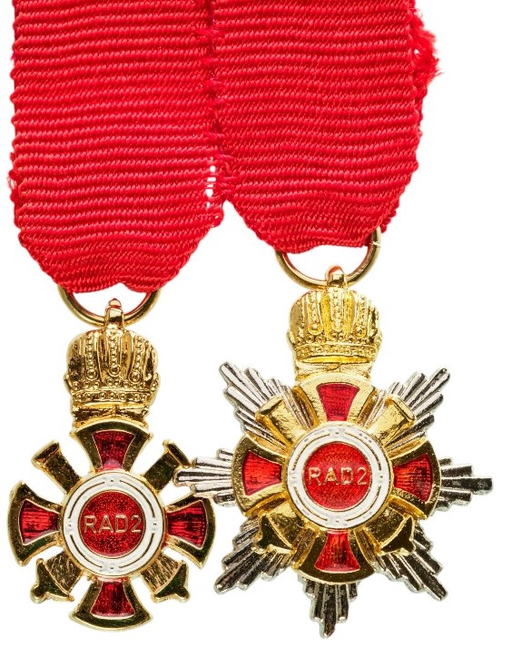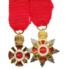 Grand Cross Set Miniatures. Breast Badge, 24x15 mm, gilt Bronze, both sides enameled, original suspension crown, ring and ribbon. Breast Star, 25 mm, gilt and silvered, superimposed part enameled, original suspension ring and ribbon. A beautiful rare set, in very fine condition! I/II R!