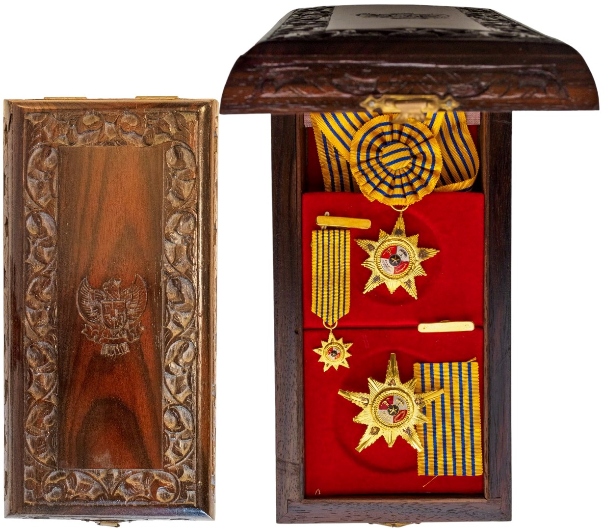 First Class Set. Sash Badge, 47 mm, gilt Bronze, reverse inscription, original suspension ring and long ladies sash. Breast Star, 58 mm, gilt Bronze, reverse inscription, reverse with large vertical pin. In superb, decorated original wooden case of issue, with miniature and metal bar. A superb, rare set, in mint condition, awarded to Dr. Nafis Sadik, special United Nations representant! I RR!