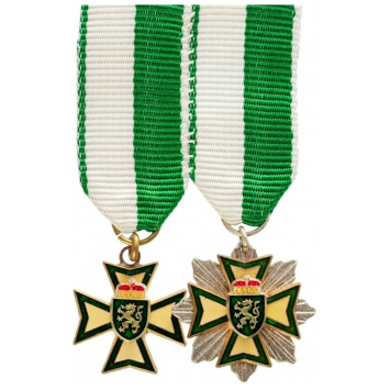 Grand Officer's Set Miniatures. Breast Badge, 17x15 mm, gilt Bronze, one side enameled, original suspension ring and ribbon. Breast Star, 20mm, gilt and silvered, superimposed part enameled, original suspension ring and ribbon. A beautiful rare set, in extremely fine condition! I R!