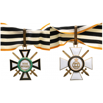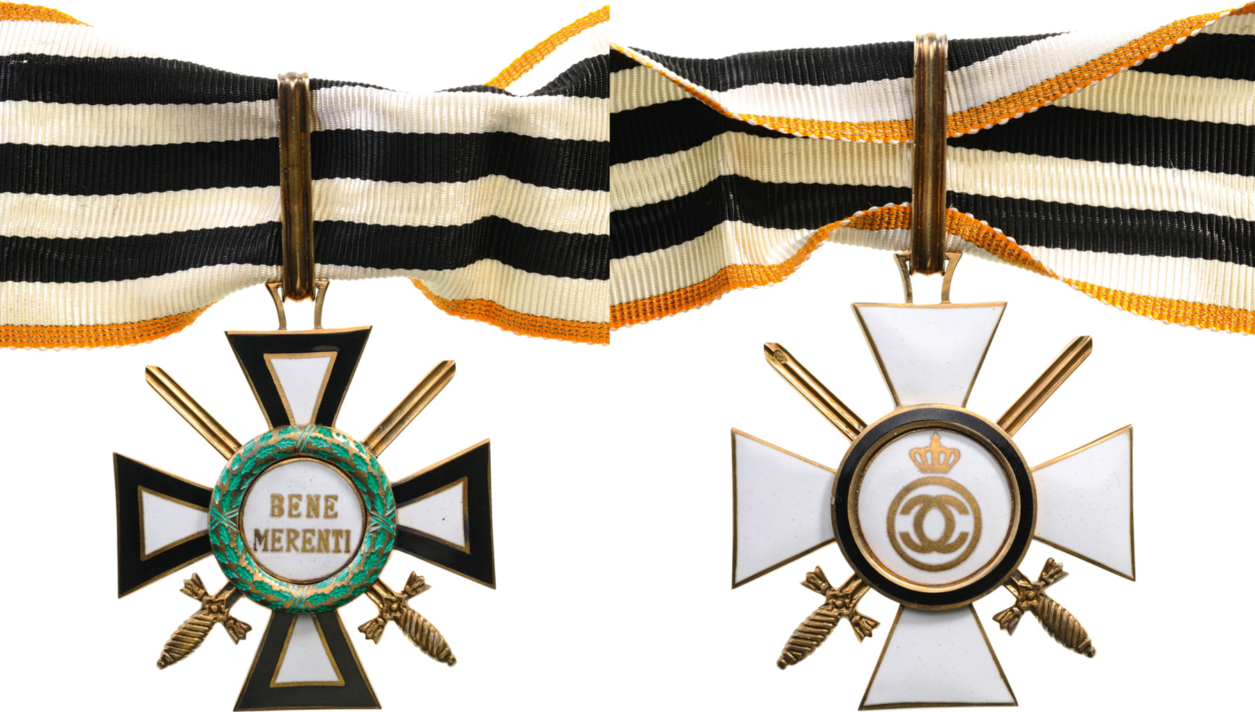 Commander Cross, 2nd Class, Military, 43 mm in gilt Silver, both sides enameled, obverse with "BENE MERENTI", on reverse the cipher of King Carol II, two swords crossed, original suspension loop and ribbon. Rare and in extremely fine condition! I R!