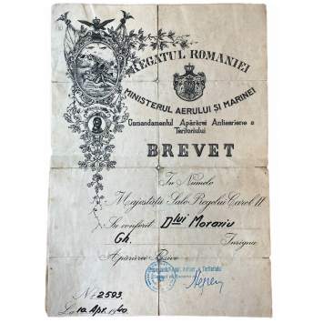 SKU: 1326 Auction has finished. Total bids: 0ROMANIAAwarding Document, 296x210 mm, dated 10.04.1940. Very rare! II RR! Shop ID: 94154