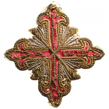Embroidered, Commander`s Star, 83 mm, in GOLD bullion-wire and sequined rays, centre cross in red velvet with gold-embroidered, red letters, white sheepskin reverse with tin-plated iron fastening clip. A very rare, early star, dating from the late 18th or the earliest 19th Century.Very fine condition. II RR!
