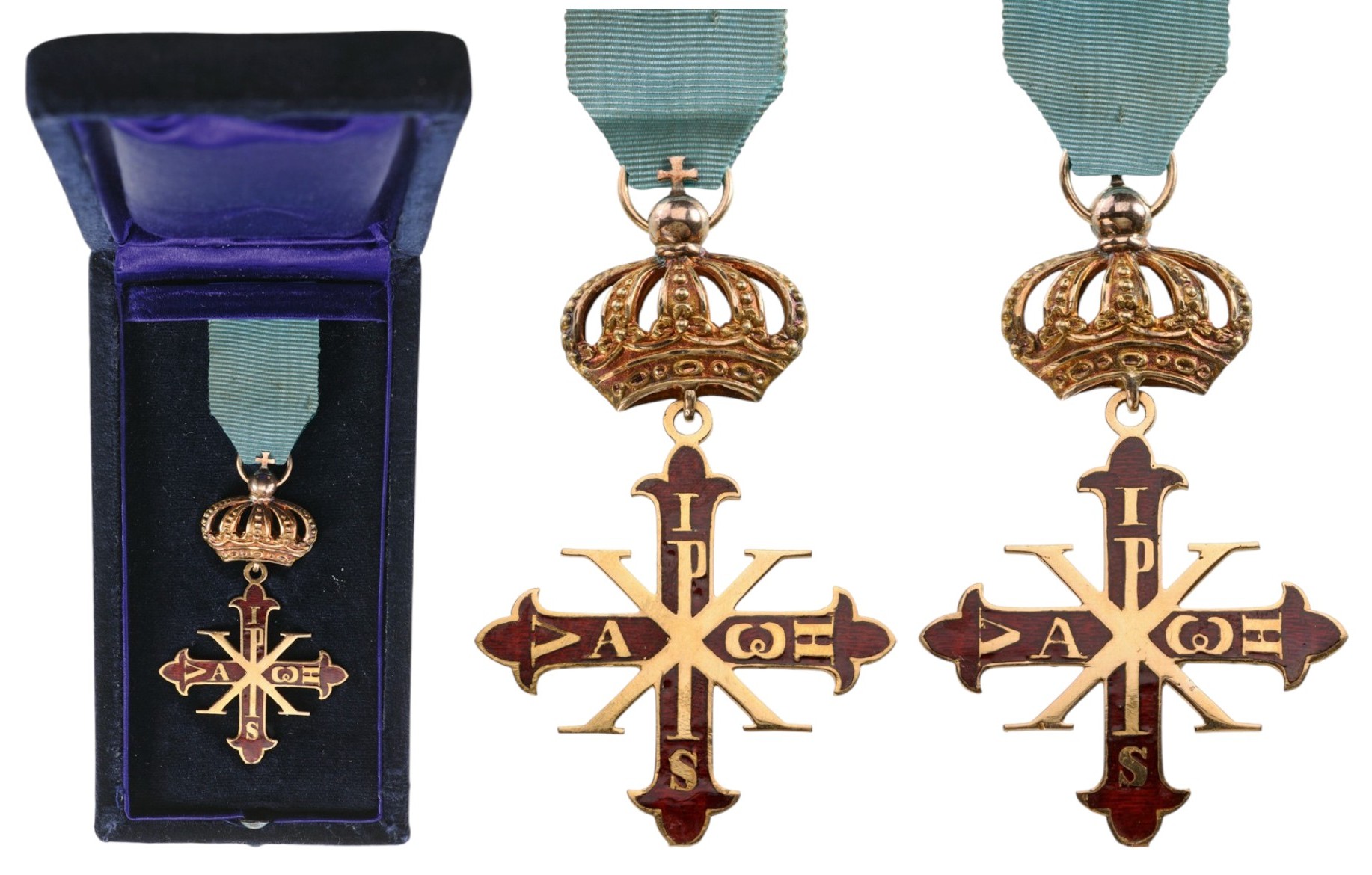 An early Breast Badge 75x45 mm. GOLD, (an assay mark to the lower tip) and red enamel, large upper crown, with chiseled details, original ribbon, in a fitted, blue velvet case.