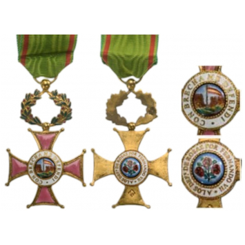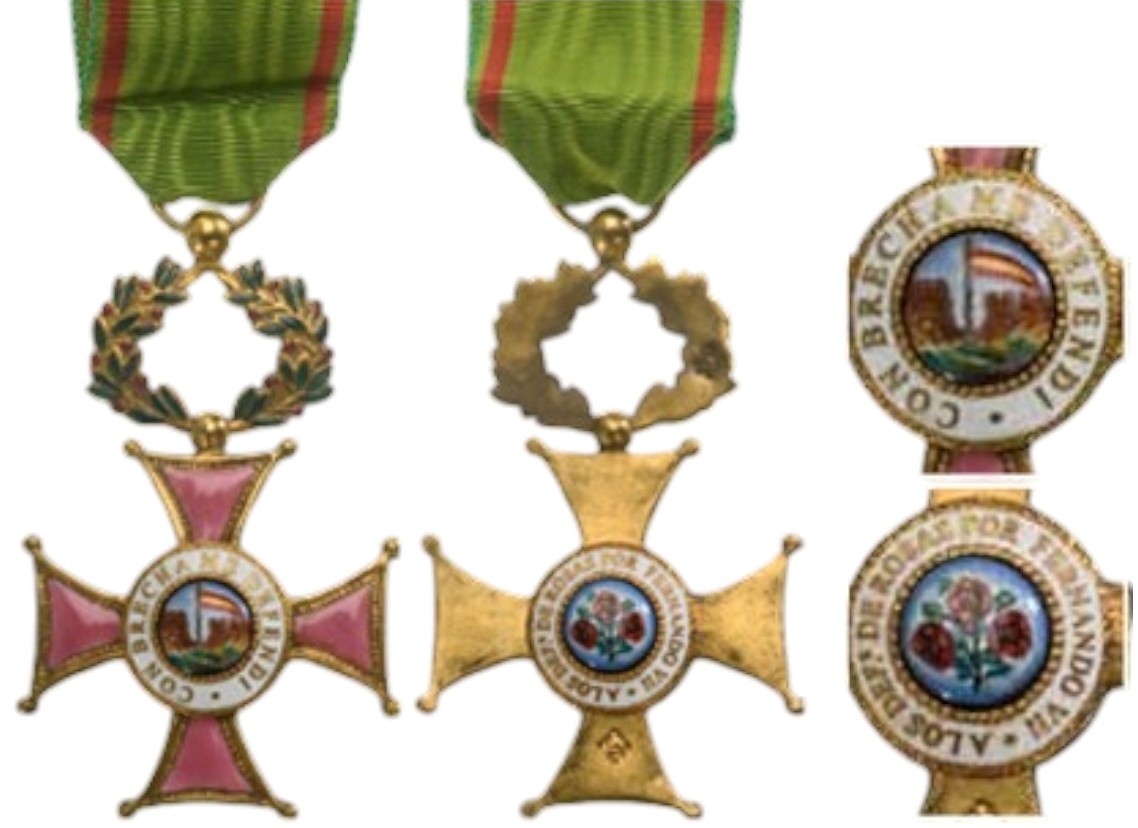 Officer’s Cross, 72x45 mm., gilt Bronze, ball-tipped cross, with rose enameled arms, surmounted by a green enameled laurel wreath, on the white obverse medallion, an image of the breach in the wall of the fortress of Rosas, above which is a Spanish flag, the whole within white enameled outer circlet inscribed “CON BRECHA ME DEFENDI”, on the reverse, blue enameled medallion, three red roses within enameled outer circlet inscribed “A los DEFENSORES DE ROSAS POR FERNANDO VII”, with original, silk ribbon.