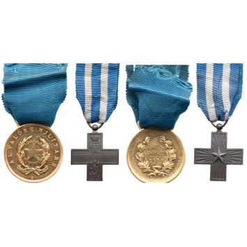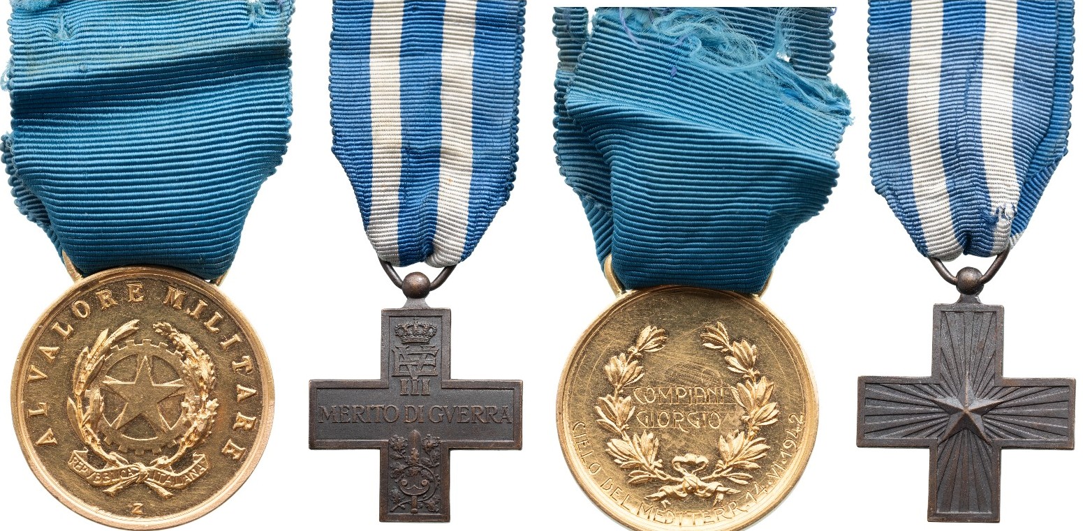 The unique and historically important, posthumous award to Pilot Sergeant-Major Giorgio Compiani; in GOLD, of the type awarded by the Republic of Italy: the obverse with the state’s coat-of-arms and, below the “Z” mark, indicating and officially-made piece, struck at the State Mint in Rome; the reverse with laurel wreath and in the field, the engraved recipient’s name “COMPIANI / GIORGIO” and around, below “CIELO DEL MEDITERR. 14. VI. 1942”; typical “stirrup” suspension and original ribbon; TOGETHER, from Compiani’s estate, a War Merit Cross, Kingdom type; a particularly fine piece, patinated bronze, with original ribbon.