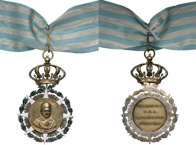 Neck Badge, 82x5 mm., gilt Silver, the obverse as an eight-pointed, white enameled star flanked by thin, short beams and around, a green enameled laurel wreath, gilt centre medallion with the bust of St. Thomas Aquinas and the inscription around “DIVUS THOMAS AQUINUS REGIAE NEAPOLITANAE STUDIORUM UNIVERSITATIS PROFESSOR ET PATRONUS”, upper, large Royal crown with round, link ring and thin, vertical ribbon ring, the reverse with centre medallion bearing the inscription “FERDINANDVS II P.F.A. BONARUM ARTIUM STATOR 1850”, with original ribbon of the type used to indicate the title of Honourary Professor, a title rarely granted to prominent, foreign personalities in the fields of Science, Letters and Arts. A beautiful, extremely rare Academic badge, excellent condition and with fine, attractive patina. I RR!