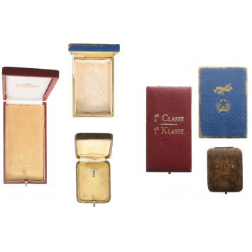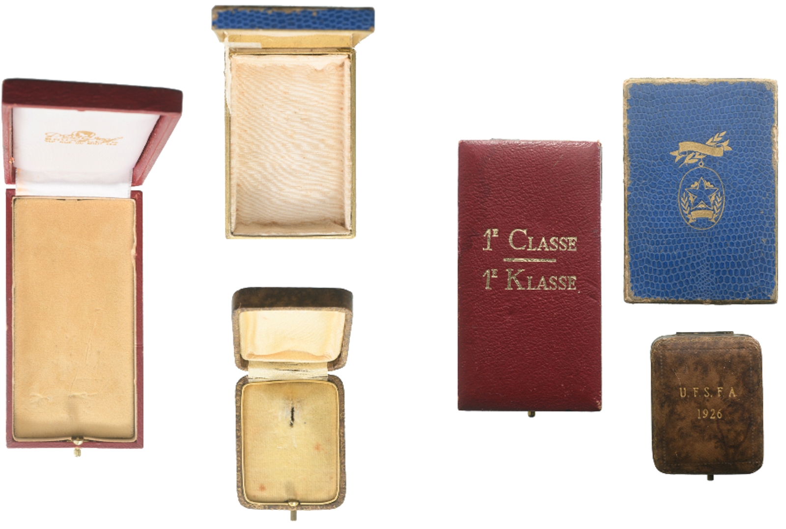 Medal and Pins Boxes, Belgium, France (U.F.S.F.A.), Yugoslavia?. Cases of issue, with gilt weapons and inscriptions on the lid. Extremely fine condition!! I-II (3)