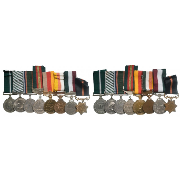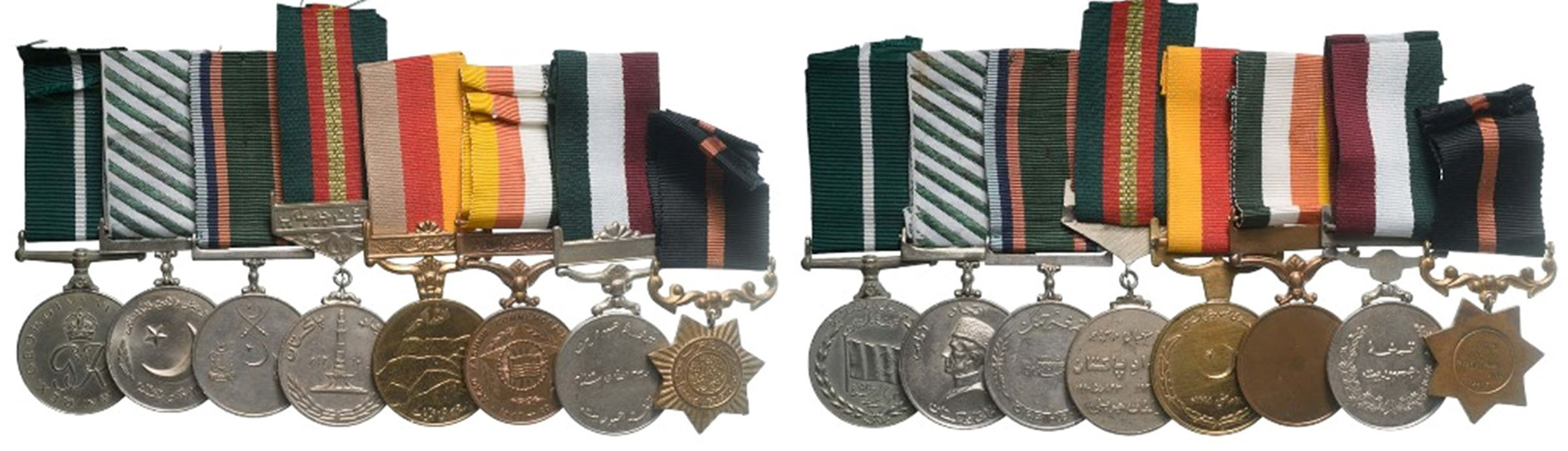 Independence Medal, 1947, Copper-Nickel; Azad Kashmir Ind. Medal, 1948, Bronze; Sitara-i-Harb Medal, 1965, Brass; Tamgha-i-Jang, Medal, 1965, Copper-Nickel; Quaid-e-Azam Medal, 1976 100 Years, Copper-Nickel; Tamgha-i-Jumhuriat Medal, 1988; Quarardad-i-Pakistan Medal, 1990, Copper-Nickel; Copper-Nickel; Tamgha-i-Baqa Medal, 1998, Brass; Quaid-e-Azam Medal, 1976 100 Years, Copper-Nickel. A very interesting group of representative medals of Pakistan, in various metals, original suspension rings and ribbons. I-II R! (8)
