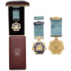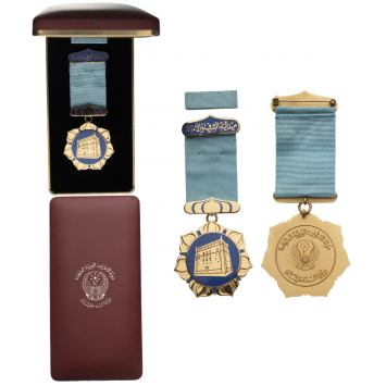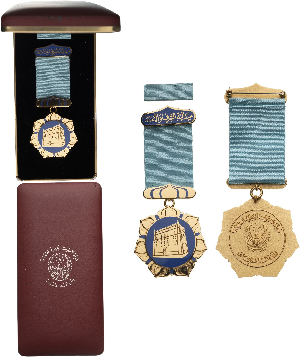Breast Badge, 62x50 mm, gilt Bronze, one-side enameled, original suspension ring, ribbon with ribbon bar and ornamented and enameled suspension bar. A very rare Pattern with blue enameled rays instead of green, in case of issue with gilt weapon on the lid and cardboard protection box with gilt weapon on the lid, by "Fattorini - Birmingham"! The Medal for Honour and Security is bestowed upon Police and Security force members who have performed duty with the utmost honesty and sincerity. The Medal features an outer design of seven petals, representative of the seven Emirates. The central design displays the Murabba Fort at Al Ain in Abu Dhabi, which was the old headquarters and prison of the police force. I RR!
