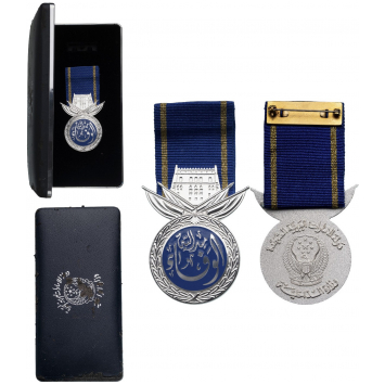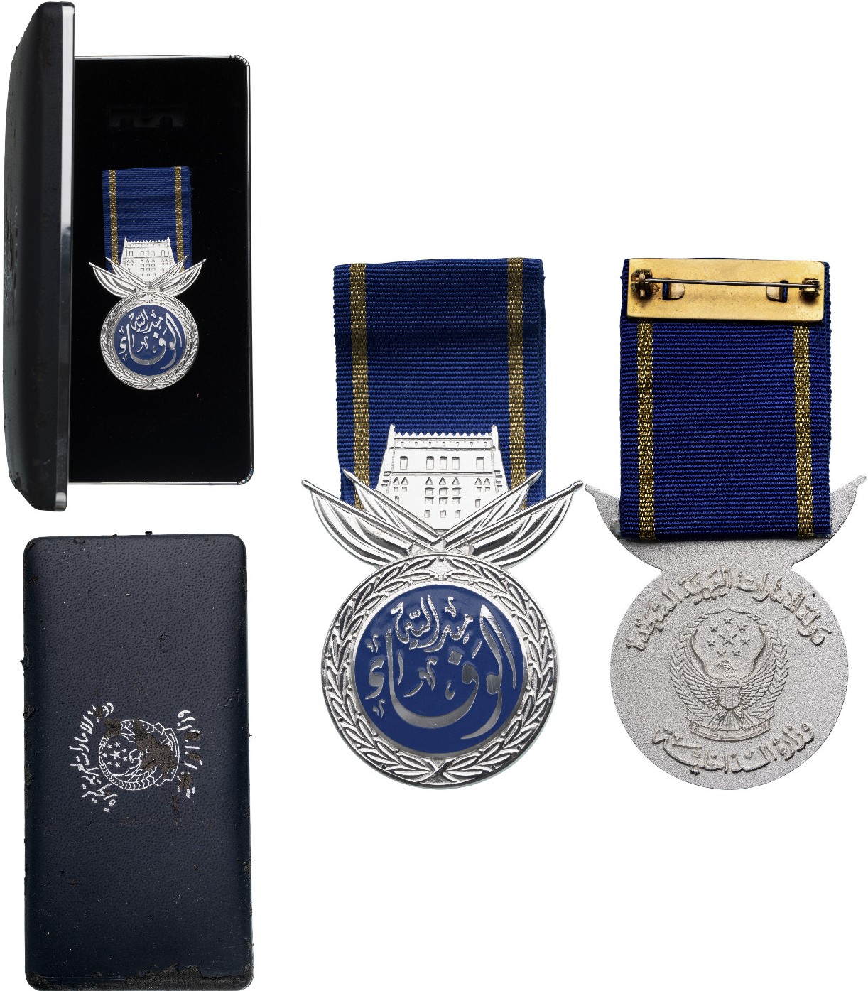 Breast Badge, 59x39 mm, silvered, one-side enameled, original suspension ring and ribbon, in case of issue with gilt weapon on the lid and cardboard protection box with gilt weapon on the lid, by "Fattorini - Birmingham"! The Loyalty Medal may be earned by those retiring from service in the Police and Security force after a minimum period of twenty years distinguished by dedication and sincerity, free of any disciplinary offense, to acknowledge success in the completion of their service. The central medallion features the calligraphic inscription 'Loyalty Medal' on a background of blue enamel, enclosed by a wreath of laurel leaves symbolising victory. The suspension takes the form of the Murabba Fort at Al Ain, the old police headquarters, above the flags of state. Rare! I R!