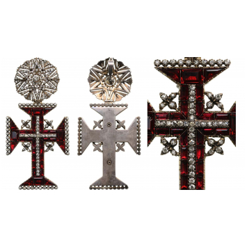 An early 19th Century, Jewelled Badge of the Order, 118x55 mm., Silver, completely set with red pastes, centred and sided by white pastes, the corners, with jewelled "fleurs-de-lys", plain reverse, round suspension with a six-pointed star and gilt stylized leaves, completely set with white stones, the reverse with well-visible, elaborate, mounting of the various elements and upper suspension loop. An excellent, rare piece of the best manufacture and quality. I RR!